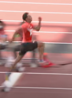 Al igual que el atleta japonés el estadounidense hace 3 y medio y bate con la pierna izquierda por lo que la secuencia del salto va a ser practicamente la misma. Pierna derecha libre y brazo izquierdo arriba para que se alternen con brazo y piernas contrarias así dos veces hasta completar la extensión.